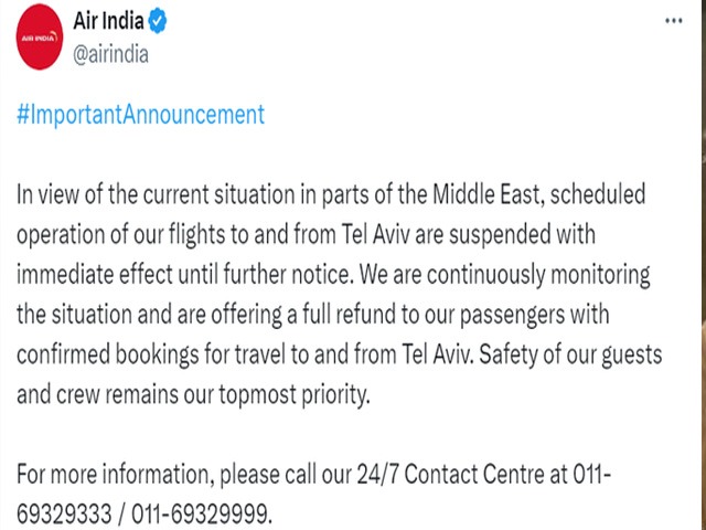 एयर इंडिया की तेल अवीव से आने-जाने वाली हमारी उड़ानें अगले नोटिस तक तत्काल प्रभाव से निलंबित