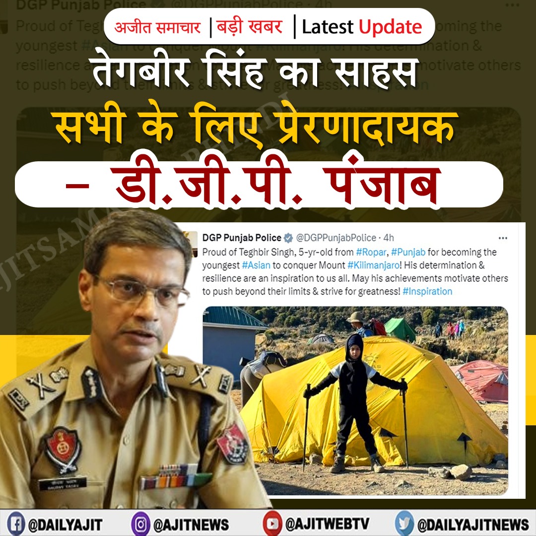 चंडीगढ़, 26 अगस्त- डी.जी.पी पंजाब ने ट्वीट किया कि हमें रोपड़ के 5 वर्षीय तेगबीर सिंह पर गर्व है, जो माउंट किलिमंजारो पर चढ़ने वाले सबसे कम उम्र के एशियाई बन गए हैं। उन्होंने कहा कि उनका साहस और दृढ़ संकल्प सभी के लिए प्रेरणा का स्रोत है। इसके साथ ही उन्होंने कहा कि उनकी उपलब्धियां दूसरों को आगे बढ़ने के लिए प्रेरित करेंगी।
