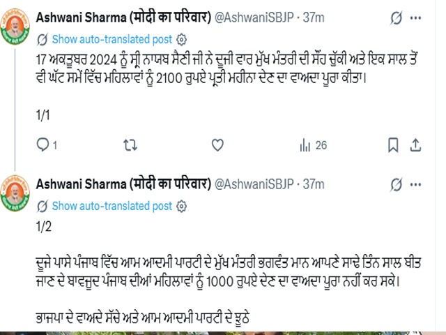 चंडीगढ़, 25 सितंबर - पंजाब भाजपा के कार्यकारी अध्यक्ष अश्विनी शर्मा ने हरियाणा के मुख्यमंत्री नायब सिंह सैनी द्वारा महिलाओं को 2100 रुपये देने की घोषणा पर ट्वीट किया और कहा कि 17 अक्टूबर, 2024 को दूसरी बार मुख्यमंत्री पद की शपथ लेने के एक साल से भी कम समय में नायब सिंह सैनी ने महिलाओं से किया अपना वादा पूरा कर दिया है, जबकि दूसरी ओर, पंजाब में आम आदमी पार्टी के मुख्यमंत्री भगवंत मान साढ़े तीन साल बाद भी पंजाब की महिलाओं को 1000 रुपये देने का अपना वादा पूरा नहीं कर पाए हैं। उन्होंने कहा कि भाजपा के वादे सच्चे हैं और आप के वादे झूठे हैं।
