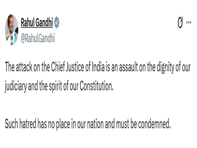 नई दिल्ली, 6 अक्टूबर- लोकसभा में विपक्ष के नेता और कांग्रेस सांसद राहुल गांधी ने कहा कि भारत के मुख्य न्यायाधीश पर हमला हमारी न्यायपालिका की गरिमा और हमारे संविधान की भावना पर हमला है। इस तरह की नफ़रत का हमारे देश में कोई स्थान नहीं है और इसकी निंदा की जानी चाहिए।