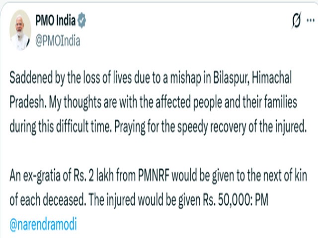 नई दिल्ली, 7 अक्टूबर- प्रधानमंत्री ने ट्वीट कर कहा कि हिमाचल प्रदेश के बिलासपुर में हुए हादसे में हुई जानमाल की हानि से उन्हें गहरा दुख हुआ है। इस कठिन समय में मेरी संवेदनाएँ प्रभावित लोगों और उनके परिवारों के साथ हैं। प्रत्येक मृतक के परिजनों को प्रधानमंत्री राष्ट्रीय राहत कोष से 2 लाख रुपये की सहायता राशि दी जाएगी। घायलों को 50,000 रुपये दिये जायेंगे।