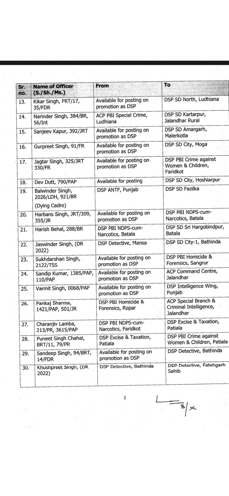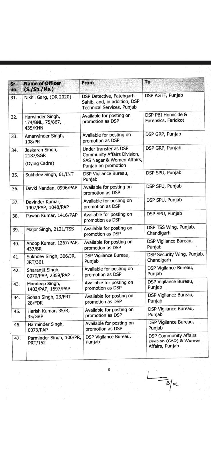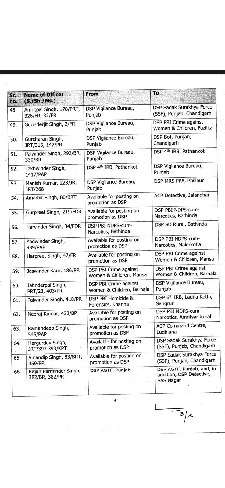 चंडीगढ़, 8 अक्टूबर- पंजाब के विभिन्न पुलिस अधिकारियों के तबादले किए गए हैं, जिनमें डीएसपी और एएसपी भी शामिल हैं।