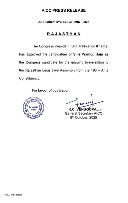 नई दिल्ली, 8 अक्तूबर - कांग्रेस ने राजस्थान विधानसभा के अन्ता निर्वाचन क्षेत्र से आगामी उपचुनाव के लिए प्रमोद जैन को पार्टी का उम्मीदवार घोषित किया है।