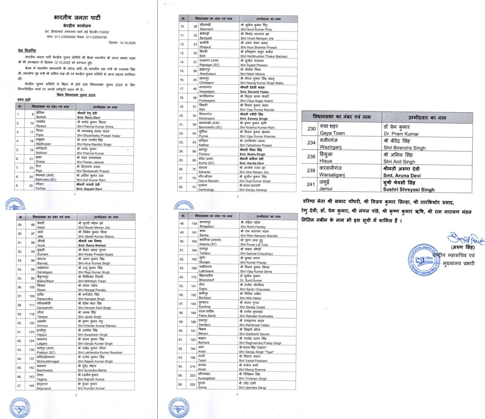 बिहार विधानसभा चुनाव के लिए भाजपा ने 71 उम्मीदवारों की पहली सूची की जारी