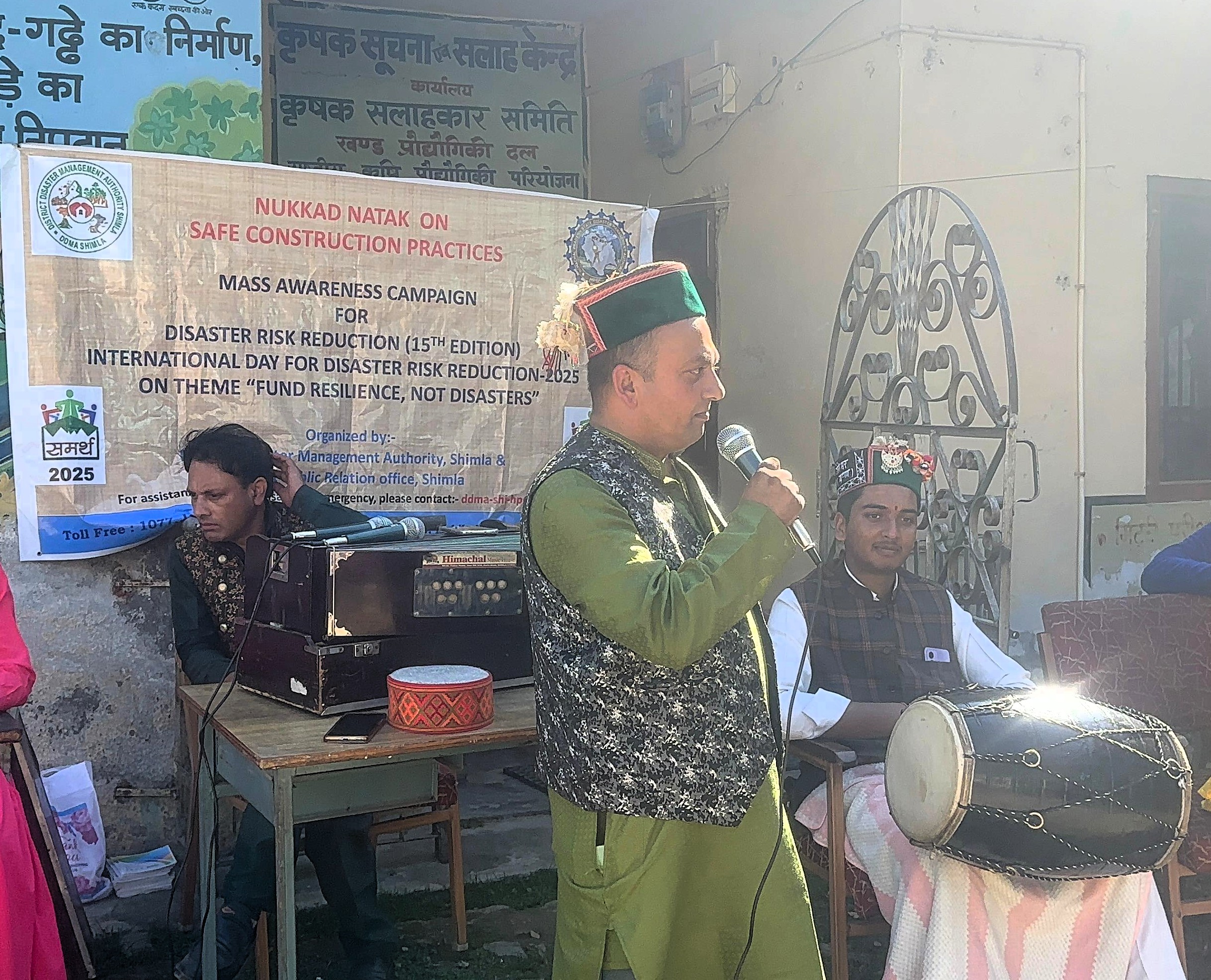 शिमला, 15 अक्तूबर - हिमाचल प्रदेश राज्य आपदा प्रबंधन प्राधिकरण द्वारा आपदा जोखिम न्यूनीकरण के संदर्भ में समर्थ-2025 का आयोजन किया जा रहा है, जिसके अंतर्गत प्रदेश में लोगों को आपदा प्रबंधन के बारे में जागरूक करने के लिए विभिन्न गतिविधियों का आयोजन किया जा रहा है। समर्थ-2025 के तहत सूचना एवं जन संपर्क विभाग के कलाकारों द्वारा नुक्कड़ नाटक के माध्यम से लोगों को जागरूक किया जा रहा है। जागरूकता अभियान की इस कड़ी में आज भगवती सांस्कृतिक मण्डल चौपाल के कलाकारों द्वारा राजकीय माध्यमिक पाठशाला कुपवी व राजकीय मॉडर्न स्कूल कुपवी, शिव रंजनी सांस्कृतिक दल बलग के कलाकारों द्वारा चिडगांव बस अड्डा व सरस्वती विद्या मंदिर स्कूल चिड़गांव में नुक्कड़ नाटक व गीत संगीत के माध्यम से स्थानीय लोगों को भूकंप, भूस्खलन, बाढ़, आगजनी जैसे विषयों पर जागरूक किया गया।