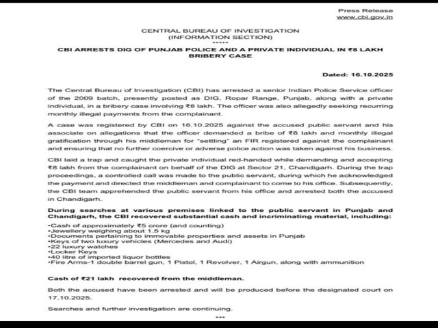 चंडीगढ़, 16 अक्टूबर - सीबीआई ने डीआईजी भुल्लर के घर से नकदी, सोने के गहने और अन्य सामान बरामद किया है, जिसका ब्योरा जारी कर दिया गया है। 5 करोड़ रुपये नकद बरामद हुए, लग्जरी गाड़ियां मिलीं और नोटों की गिनती का काम अभी भी जारी है। एक किलो से ज़्यादा सोना, कई ज़मीन के दस्तावेज़ भी मिले हैं। आपको बता दें कि आज रोपड़ रेंज के डीआईजी हरचरण सिंह भुल्लर को गिरफ्तार कर लिया गया है। डीआईजी भुल्लर सीबीआई की हिरासत में हैं। भुल्लर पर रिश्वत लेने का आरोप है।