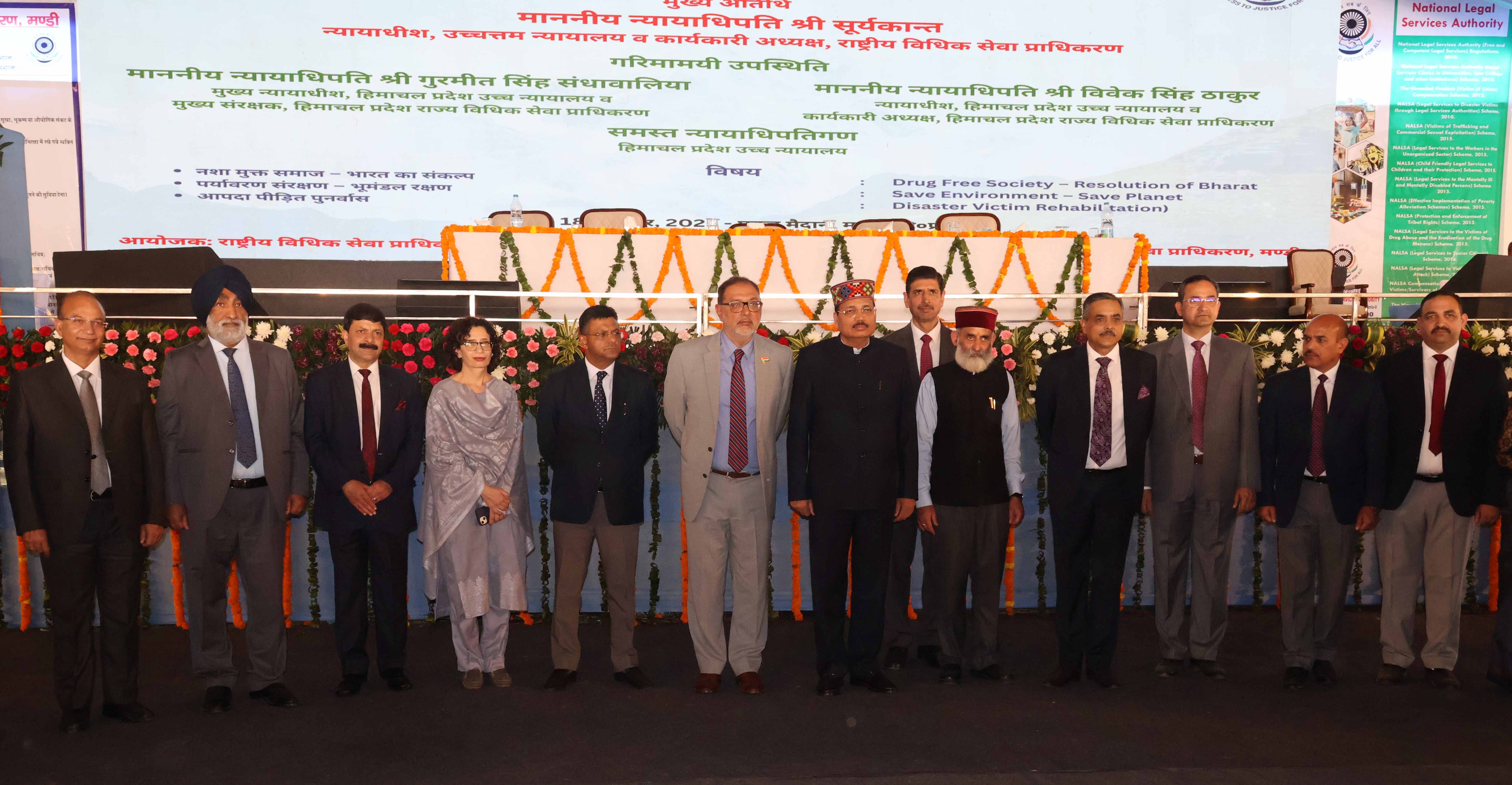 मंडी, 18 अक्तूबर (खेमचंद शास्त्री)- राष्ट्रीय विधिक सेवा प्राधिकरण एवं हिमाचल प्रदेश राज्य विधिक सेवा प्राधिकरण के संयुक्त तत्वावधान में आज मंडी में विशाल विधिक साक्षरता शिविर अभियान का शुभारंभ किया गया। इस अवसर पर उच्चतम न्यायालय के न्यायाधीश एवं राष्ट्रीय विधिक सेवा प्राधिकरण के कार्यकारी अध्यक्ष न्यायमूर्ति सूर्यकांत मुख्य अतिथि के रूप में उपस्थित रहे। हिमाचल प्रदेश उच्च न्यायालय के मुख्य न्यायाधीश एवं राज्य विधिक सेवा प्राधिकरण के मुख्य संरक्षक न्यायमूर्ति गुरमीत सिंह संधावालिया तथा उच्च न्यायालय के न्यायाधीश एवं राज्य विधिक सेवा प्राधिकरण के कार्यकारी अध्यक्ष न्यायमूर्ति विवेक सिंह ठाकुर विशेष अतिथि के रूप में उपस्थित रहे। यह शिविर नशामुक्त समाज-भारत का संकल्प, पर्यावरण संरक्षण-भूमंडल रक्षण तथा आपदा पीड़ित पुनर्वास विषयों पर केंद्रित रहा।