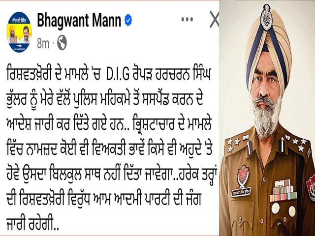 चंडीगढ़, 21 अक्टूबर- डीआईजी भुल्लर को पुलिस विभाग से निलंबित करने के आदेश जारी कर दिए गए हैं। मुख्यमंत्री भगवंत मान ने ट्वीट करके इस संबंध में जानकारी साझा की।