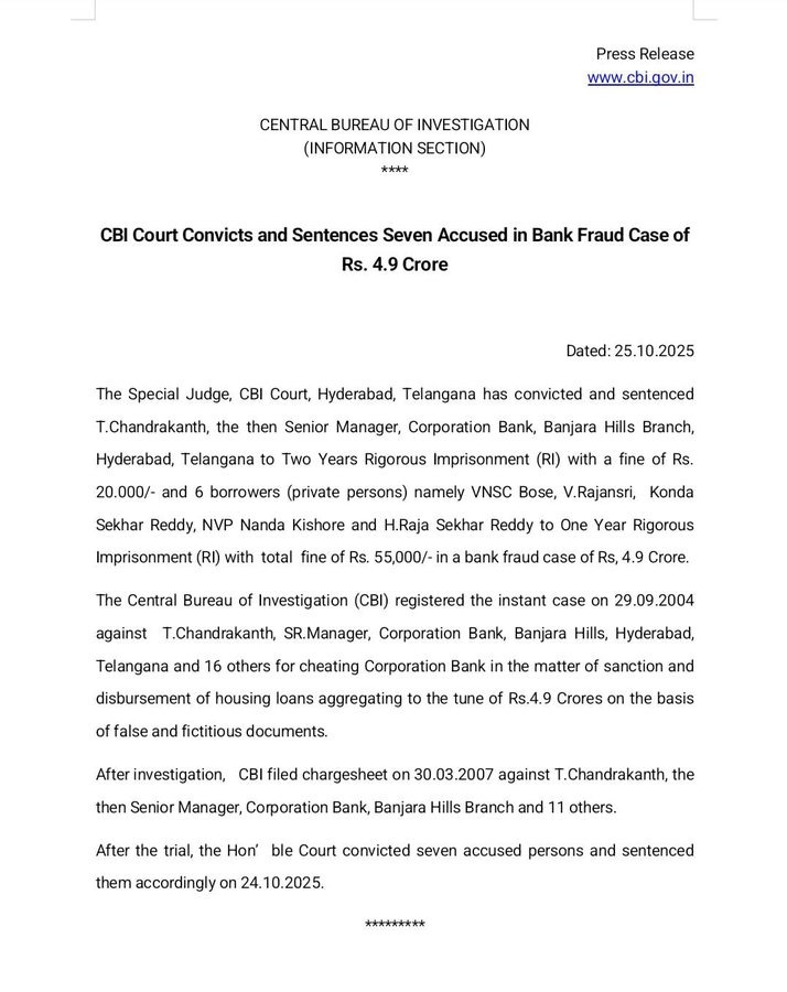 नई दिल्ली, 25 अक्टूबर - सीबीआई अदालत ने 4.9 करोड़ रुपये के बैंक धोखाधड़ी मामले में सात आरोपियों को दोषी ठहराया और सजा सुनाई।