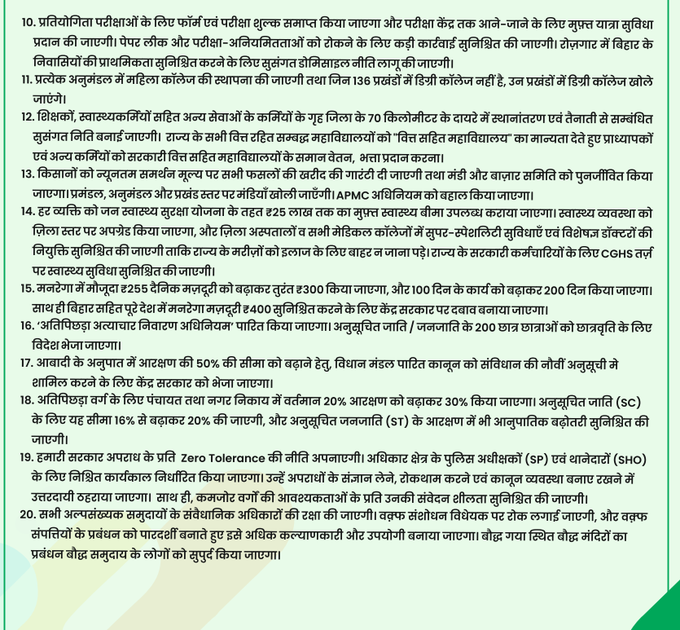 पंचायत और नगर निकायों में अति पिछड़े वर्गों के लिए वर्तमान 20% आरक्षण को बढ़ाकर 30% किया जाएगा। अनुसूचित जातियों (एससी) के लिए यह सीमा 16% से बढ़ाकर 20% की जाएगी, और अनुसूचित जनजातियों (एसटी) के लिए आरक्षण में भी आनुपातिक वृद्धि सुनिश्चित की जाएगी।