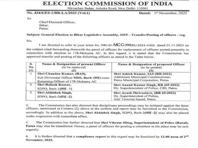 नई दिल्ली, 1 नवंबर - भारत निर्वाचन आयोग ने 178-मोकामा विधानसभा क्षेत्र से संबंधित मामले में अनुमंडल पुलिस अधिकारी बराह चंदन कुमार, अनुमंडल पुलिस अधिकारी बराह-2 राकेश कुमार और निलंबित अनुमंडल पुलिस अधिकारी बराह-2 अभिषेक सिंह के विरुद्ध अनुशासनात्मक कार्रवाई का आदेश दिया है। आयोग ने पटना के पुलिस अधीक्षक (ग्रामीण) विक्रम सिहाग के तबादले का भी निर्देश दिया है।