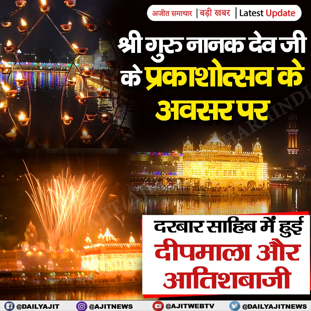 अमृतसर, 5 नवंबर- श्री गुरु नानक देव जी के प्रकाशोत्सव के अवसर पर दरबार साहिब में दीपमाला और आतिशबाजी की गई। इस दौरान बड़ी संख्या में श्रद्धालु एकत्रित हुए।