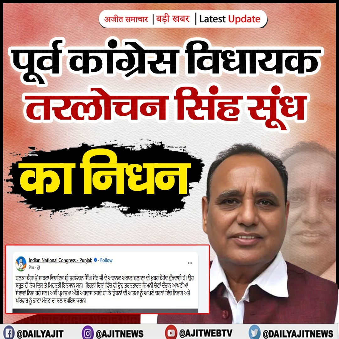 तरनतारन, 8 नवंबर - बंगा विधानसभा क्षेत्र से पूर्व कांग्रेस विधायक तरलोचन सिंह सूंध का दिल का दौरा पड़ने से आकस्मिक निधन हो गया। तरनतारन उपचुनाव के लिए तरनतारन के वार्ड नंबर 3 में प्रचार करने के बाद एक निजी होटल में उनका निधन हो गया। इस कारण कांग्रेस ने कल तरनतारन में होने वाला रोड शो रद्द कर दिया है।