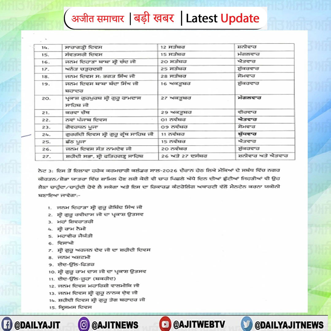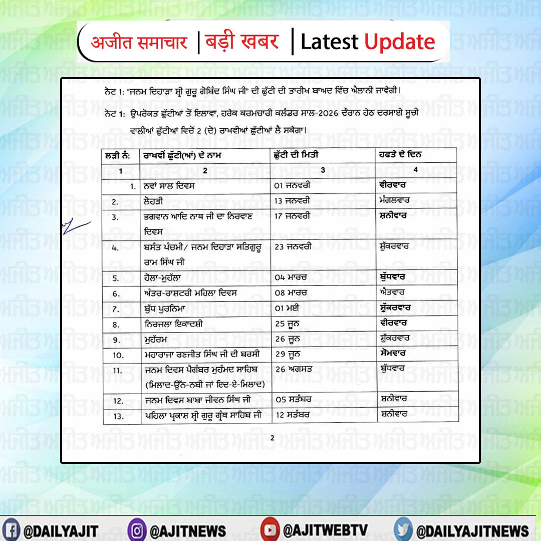 पंजाब सरकार द्वारा कैलेंडर साल 2026 के दौरान होने वाली गज़टिड छुट्टियों का ऐलान