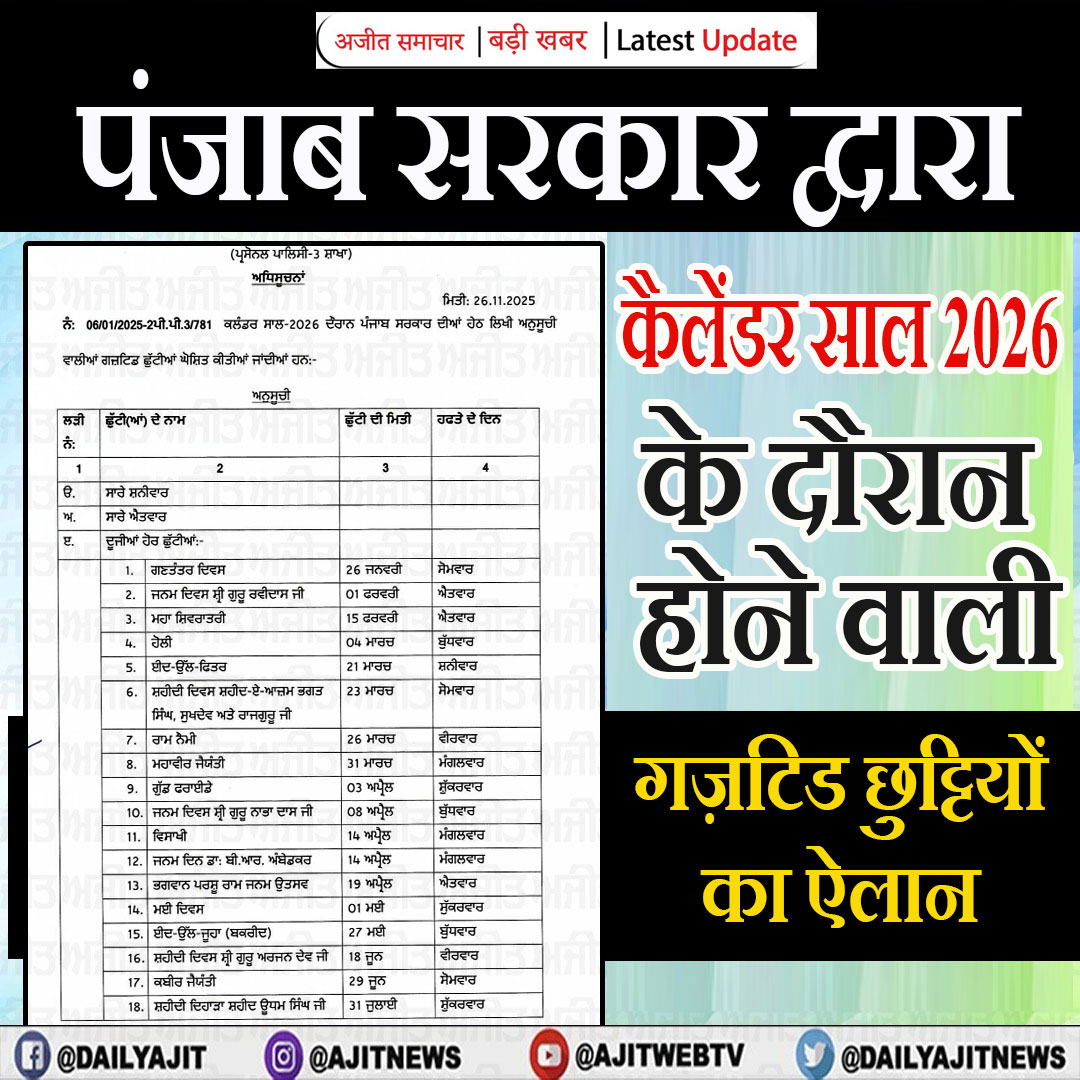चंडीगढ़, 26 नवंबर- पंजाब सरकार ने कैलेंडर साल 2026 के लिए गज़टिड छुट्टियों की घोषणा की है। श्री गुरु गोबिंद सिंह जी की जयंती से जुड़ी छुट्टी की तारीख का ऐलान बाद में किया जायगा।