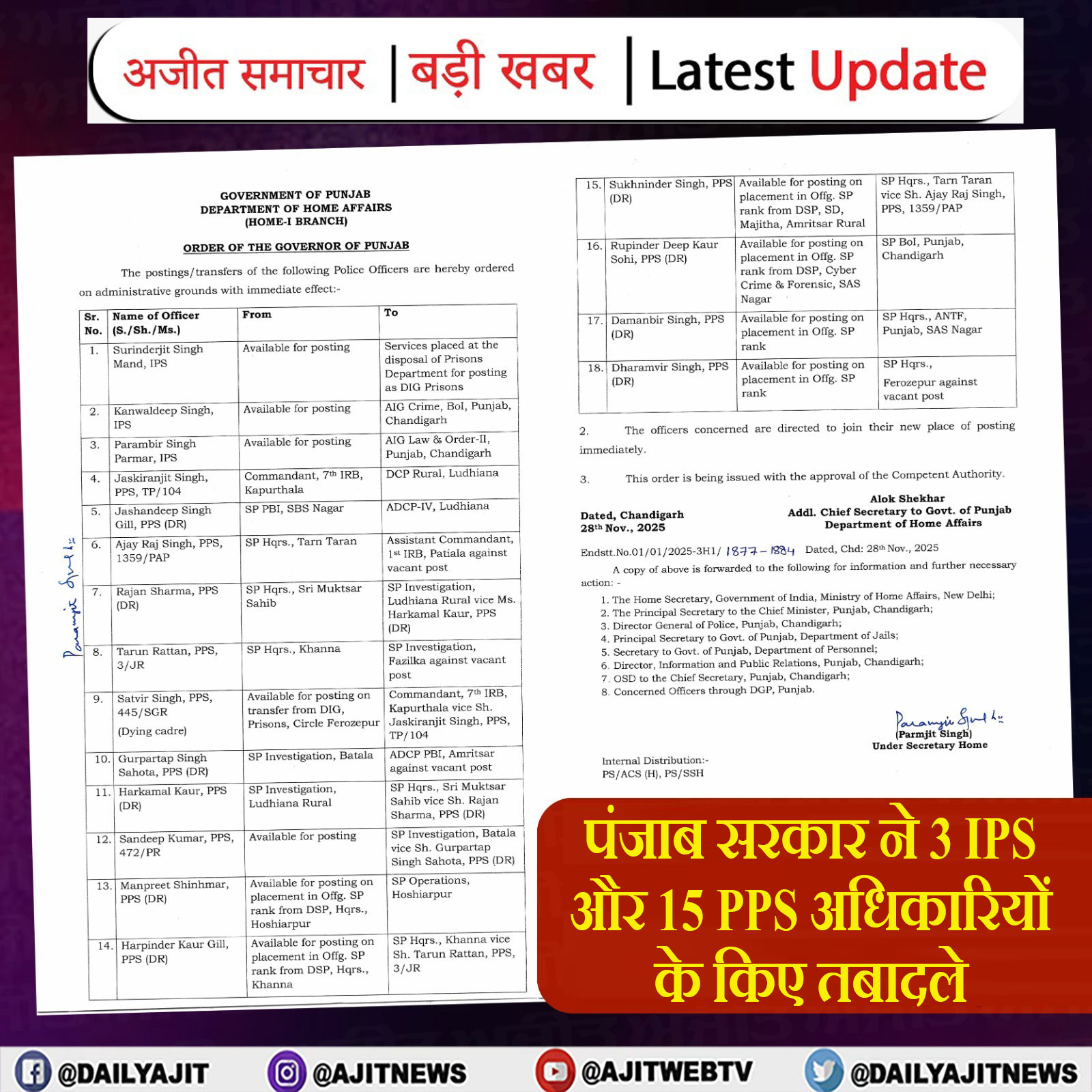 चंडीगढ़, 28 नवंबर- पंजाब सरकार के होम मिनिस्ट्री ने 3 IPS और 15 PPS अधिकारियों का तबादला किया है। पंजाब सरकार ने DGP ऑफिस की लीडरशिप में पुलिस डिपार्टमेंट में बड़े पैमाने पर तबादले किए हैं। जारी ऑर्डर के मुताबिक, ASP और DSP का तबादला किया गया है।