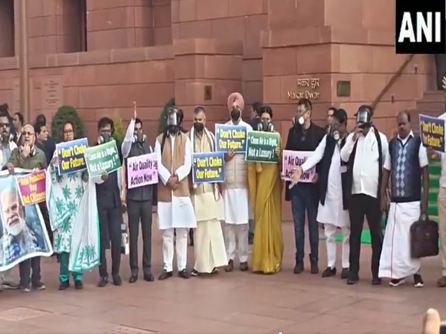 एयर पॉल्यूशन के मुद्दे पर विपक्षी सांसदों ने पार्लियामेंट कॉम्प्लेक्स में किया प्रदर्शन