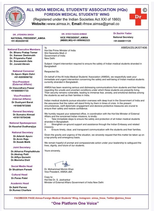चिट्ठी में लिखा है, "हम आपसे सम्मानपूर्वक अनुरोध करते हैं कि बांग्लादेश में फंसे भारतीय मेडिकल छात्रों की सुरक्षा के लिए तुरंत और ज़रूरी कदम उठाएं।