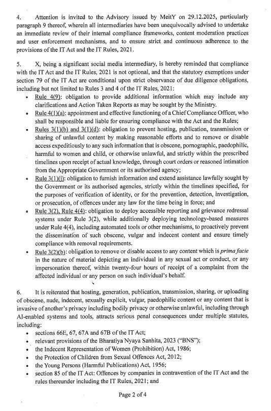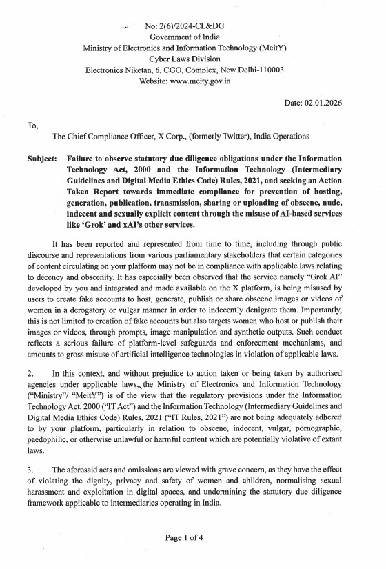 नई दिल्ली, 2 जनवरी - इलेक्ट्रॉनिक्स और सूचना प्रौद्योगिकी मंत्रालय ने X Corp. (पहले ट्विटर) के चीफ़ कंप्लायंस ऑफिसर को एक लेटर लिखा है। यह लेटर इंफॉर्मेशन टेक्नोलॉजी एक्ट, 2000 और इंफॉर्मेशन टेक्नोलॉजी (इंटरमीडियरी गाइडलाइंस और डिजिटल मीडिया एथिक्स कोड) रूल्स, 2021 के तहत कानूनी ड्यू डिलिजेंस जिम्मेदारियों का पालन न करने के बारे में है। इसमें 'ग्रोक' और xAI की दूसरी AI-बेस्ड सर्विसेज़ के गलत इस्तेमाल से अश्लील, नग्न, अभद्र और सेक्शुअली एक्सप्लिसिट कंटेंट को होस्ट करने, बनाने, पब्लिश करने, ट्रांसमिट करने, शेयर करने या अपलोड करने से रोकने के लिए तुरंत कार्रवाई करने और एक्शन टेकन रिपोर्ट मांगी गई है।