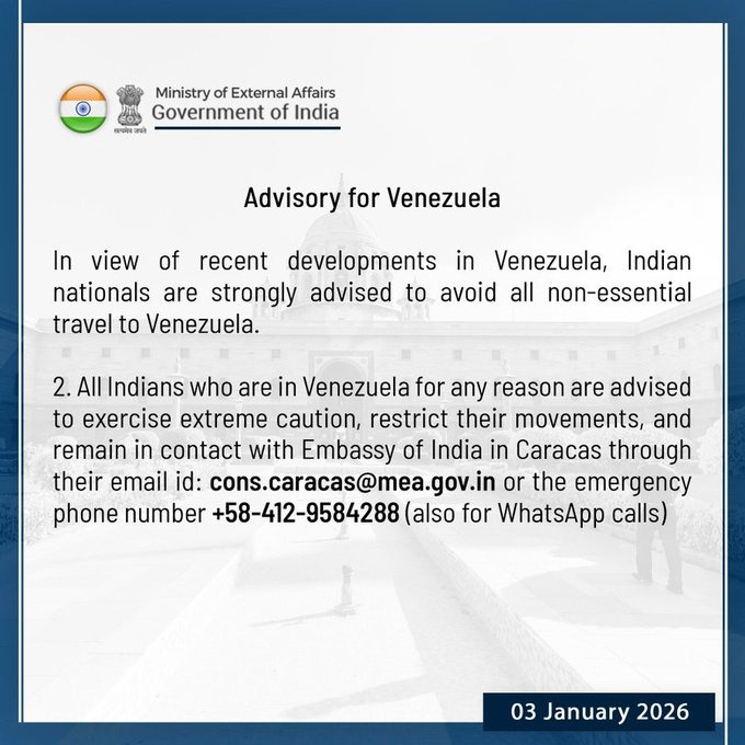 नई दिल्ली, 4 जनवरी - विदेश मंत्रालय (MEA) ने वेनेजुएला के लिए एक एडवाइजरी जारी की है, "वेनेजुएला में हाल के घटनाक्रमों को देखते हुए, भारतीय नागरिकों को सलाह दी जाती है कि वे वेनेजुएला की गैर-ज़रूरी यात्रा से बचें। जो भी भारतीय किसी भी कारण से वेनेजुएला में हैं, उन्हें बहुत सावधानी बरतने, अपनी आवाजाही सीमित रखने और कराकस में भारतीय दूतावास के संपर्क में रहने की सलाह दी जाती है।