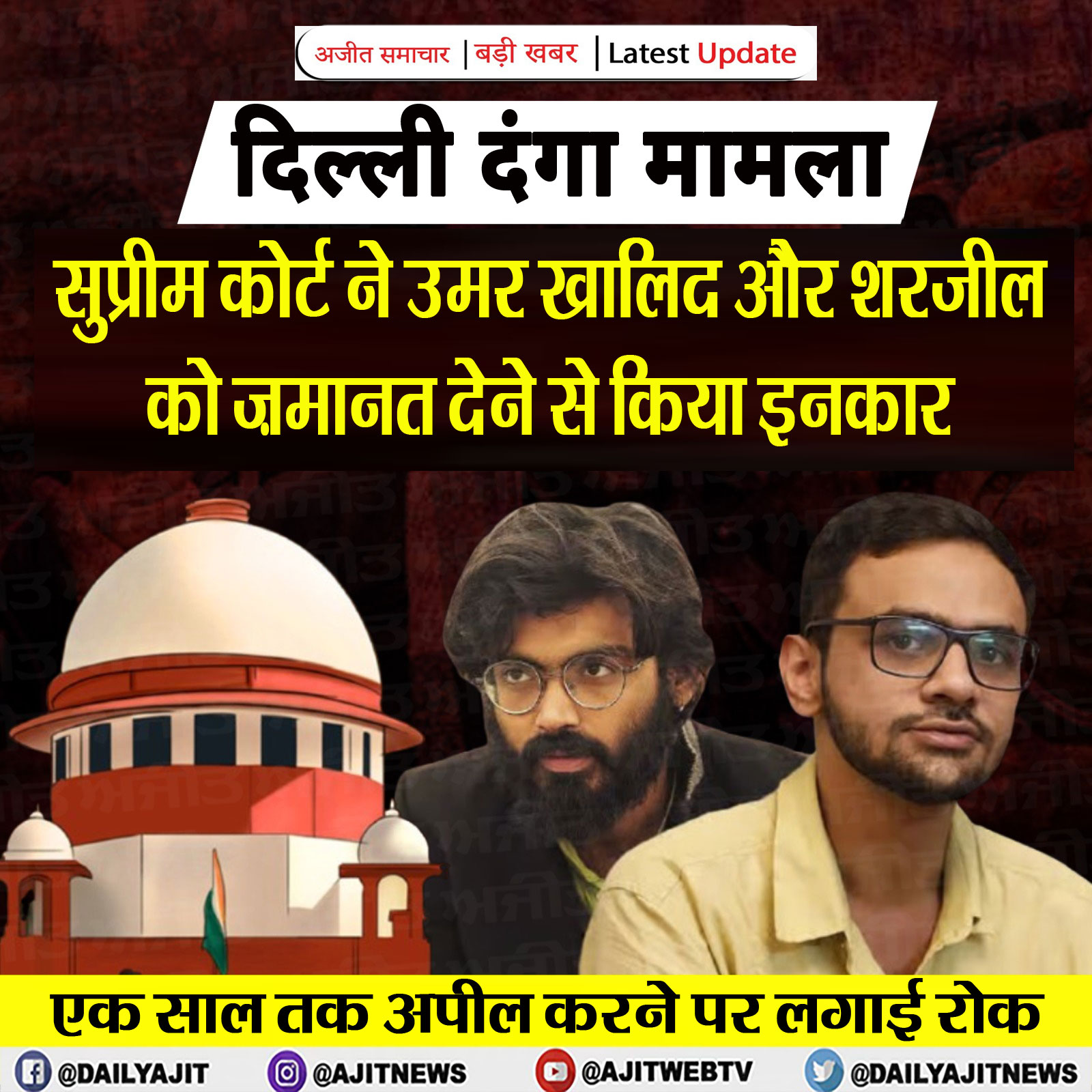 नई दिल्ली, 5 जनवरी- सुप्रीम कोर्ट ने आज दिल्ली दंगों के आरोपी उमर खालिद और शरजील इमाम को ज़मानत देने से इनकार कर दिया। हालांकि, पांच अन्य आरोपियों को 12 शर्तों के साथ ज़मानत दे दी गई। सुप्रीम कोर्ट ने कहा कि उमर और शरजील इस मामले में एक साल तक ज़मानत अर्ज़ी नहीं दे सकते।