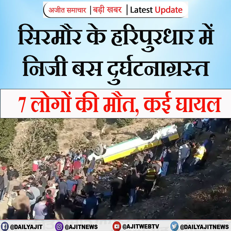 सिरमौर (हिमाचल प्रदेश), 9 जनवरी - सिरमौर ज़िले के हरिपुरधार क्षेत्र में अभी कुछ देर पहले एक भीषण सड़क हादसा हुआ है। यहां जीत कोच नामक निजी बस गहरी खाई में गिर गई। जानकारी मिली है कि बस हरिपुरधार से नोहराधार की तरफ जा रही थी। बताया जा रहा है कि बस के अंदर और छत पर भी सवारियां भरी हुई थी। दुर्घटना में करीब आधा दर्जन लोगों के मरने की अपुष्ट सूचना है।
