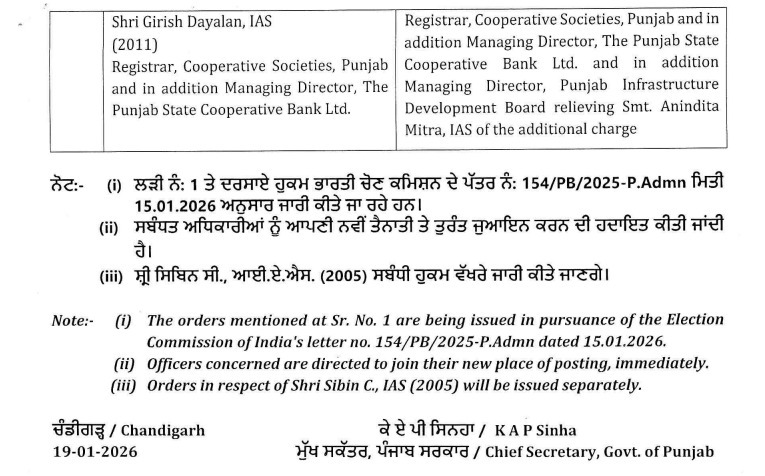 पंजाब सरकार ने बड़े पैमाने पर प्रशासनिक अधिकारियों के तबादले