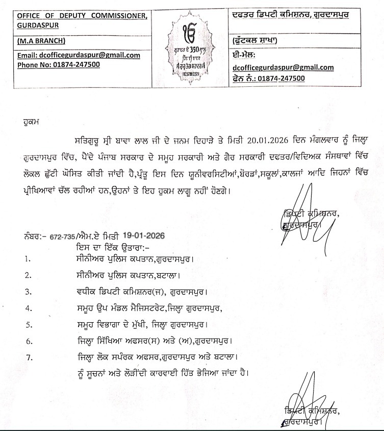 DC द्वारा 20 जनवरी को गुरदासपुर जिले में लोकल छुट्टी की घोषणा