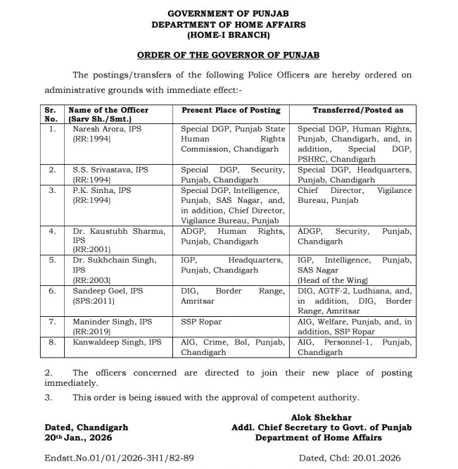 #पंजाब सरकार के गृह विभाग द्वारा आइपीएस अधिकारियों का स्थानांतरण