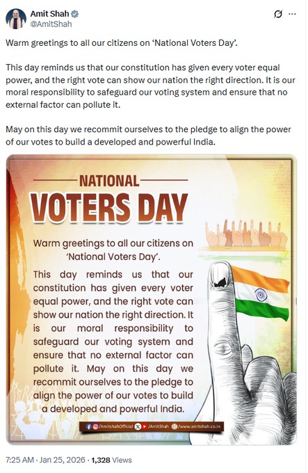 नई दिल्ली, 25 जनवरी - केंद्रीय गृह मंत्री अमित शाह ने ट्वीट किया, "सभी नागरिकों को 'राष्ट्रीय मतदाता दिवस' की हार्दिक शुभकामनाएं। यह दिन हमें याद दिलाता है कि हमारे संविधान ने हर मतदाता को समान शक्ति दी है, और सही वोट हमारे देश को सही दिशा दिखा सकता है। यह हमारी नैतिक ज़िम्मेदारी है कि हम अपनी वोटिंग सिस्टम की रक्षा करें और यह सुनिश्चित करें कि कोई बाहरी कारक इसे दूषित न कर सके। इस दिन हम एक विकसित और शक्तिशाली भारत बनाने के लिए अपने वोटों की शक्ति का सही इस्तेमाल करने का संकल्प लें।