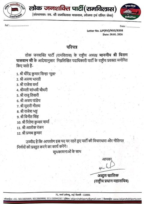 लोक जनशक्ति पार्टी (रामविलास) द्वारा पार्टी के 12 नेताओं को राष्ट्रीय प्रवक्ता नियुक्त