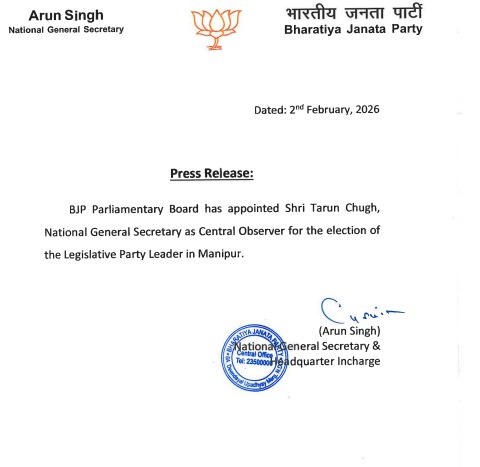 #तरुण चुघ मणिपुर में लेजिस्लेटिव पार्टी लीडर के चुनाव के लिए सेंट्रल ऑब्ज़र्वर नियुक्त