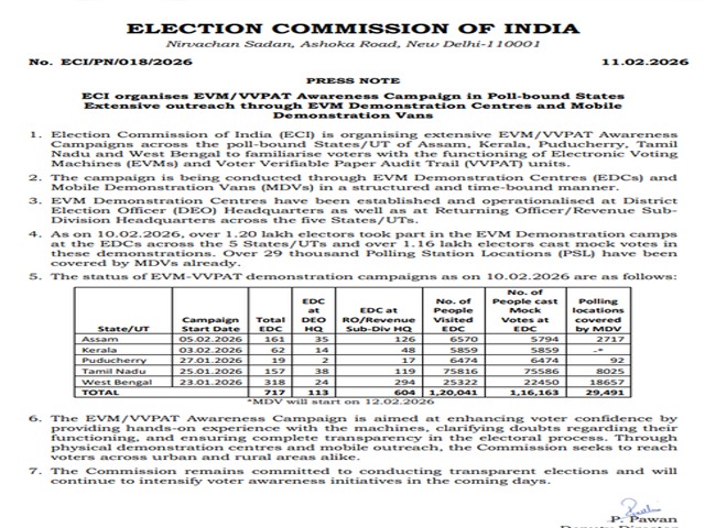 नई दिल्ली, 11 फरवरी - भारत का चुनाव आयोग असम, केरल, पुडुचेरी, तमिलनाडु और पश्चिम बंगाल जैसे पोलिंग वाले राज्यों/UTs में बड़े पैमाने पर EVM/VVPAT जागरूकता कैंपेन चला रहा है ताकि वोटर्स को इलेक्ट्रॉनिक वोटिंग मशीन और वोटर वेरिफ़िएबल पेपर ऑडिट ट्रेल (VVPAT) यूनिट्स के काम करने के तरीके के बारे में जागरूक किया जा सके।