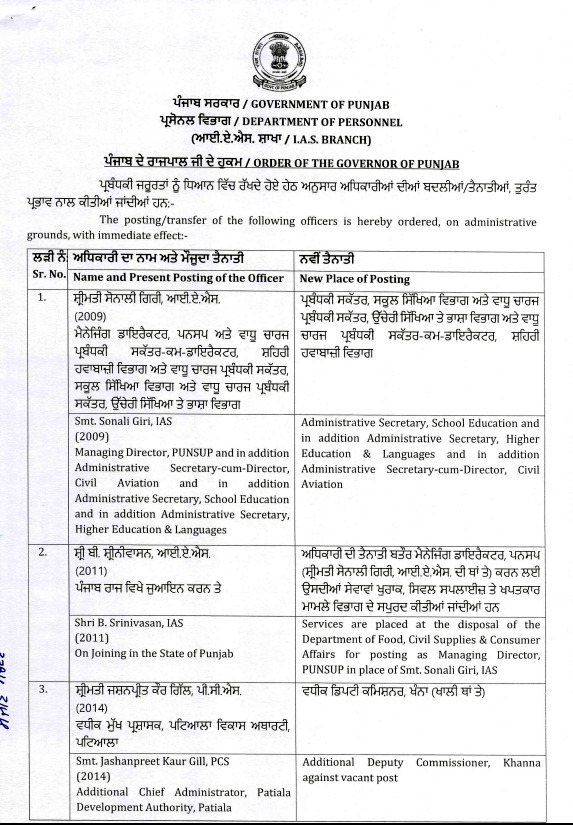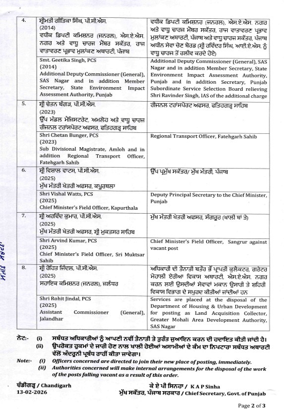 चंडीगढ़, 13 फरवरी - पंजाब के 2 IAS और 6 PCS अधिकारियों का तबादला किया गया है।