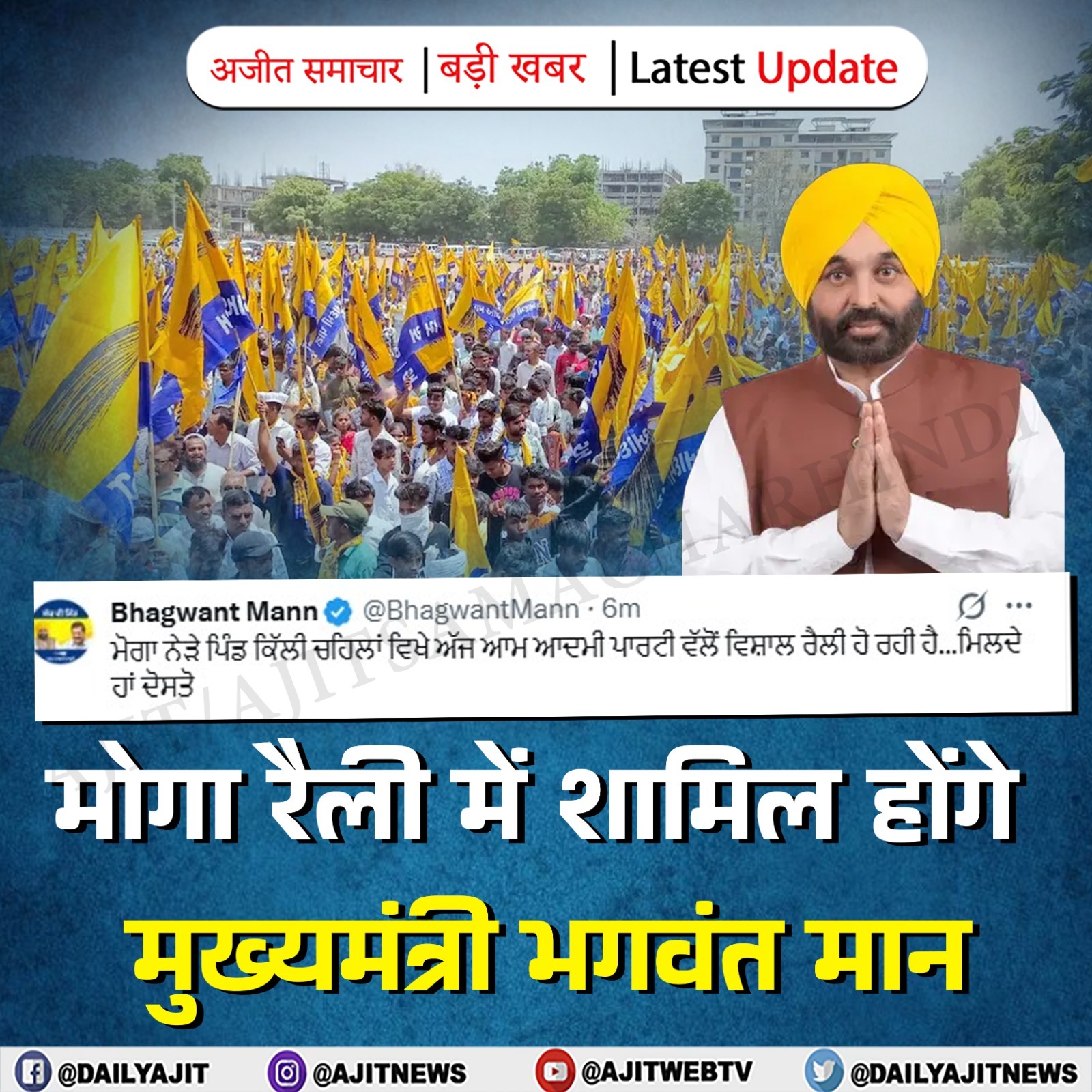 चंडीगढ़, 16 फरवरी- मुख्यमंत्री भगवंत मान आज मोगा में पंजाब सरकार की रैली में शामिल होंगे। उन्होंने इस बारे में सोशल मीडिया पर एक पोस्ट शेयर किया है।