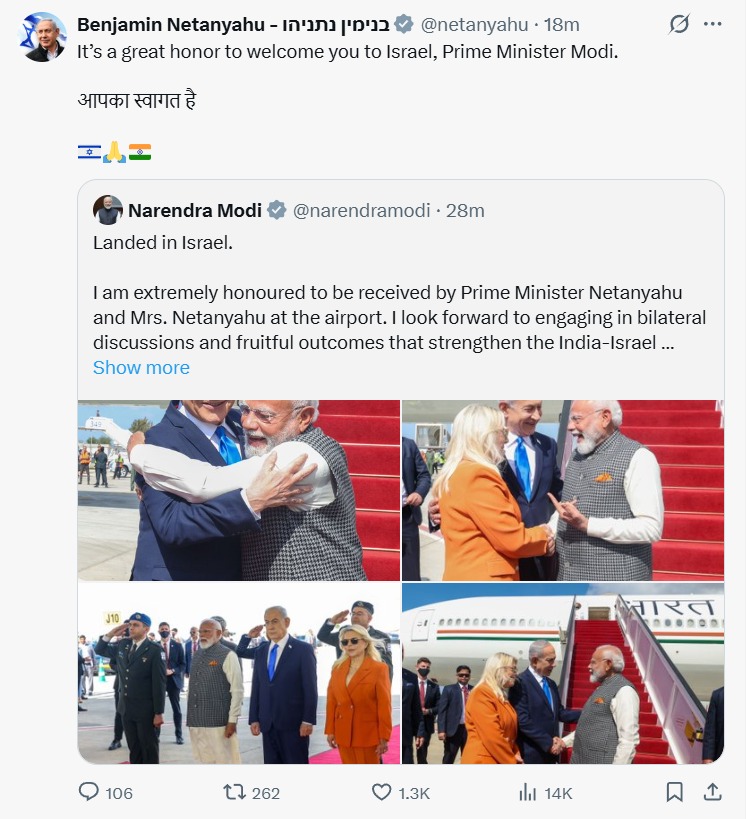 इजरायल के प्रधानमंत्री बेंजामिन नेतन्याहू ने प्रधानमंत्री नरेंद्र मोदी के ट्वीट पर जवाब देते हुए लिखा, "प्रधानमंत्री मोदी, इजरायल में आपका स्वागत करना मेरे लिए बहुत सम्मान की बात है। आपका स्वागत है..."