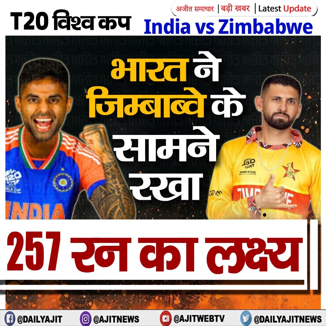 अभिषेक शर्मा और हार्दिक पांड्या की अर्धशतकीय पारियों की मदद से भारत ने जिम्बाब्वे को 257 रनों का लक्ष्य दिया है। करो या मरो मुकाबले में जिम्बाब्वे ने टॉस जीतकर भारत को पहले बल्लेबाजी का न्योता दिया। भारतीय टीम ने 20 ओवर में चार विकेट पर 256 रन बनाए। यह टी20 विश्व कप में भारत का सर्वोच्च स्कोर है। टीम ने इस तरह वैश्विक टूर्नामेंट में अपना 19 साल पुराना रिकॉर्ड तोड़ा। इस टूर्नामेंट में इससे पहले भारत का सबसे बड़ा टोटल 2007 में इंग्लैंड के खिलाफ चार विकेट पर 218 रन था।