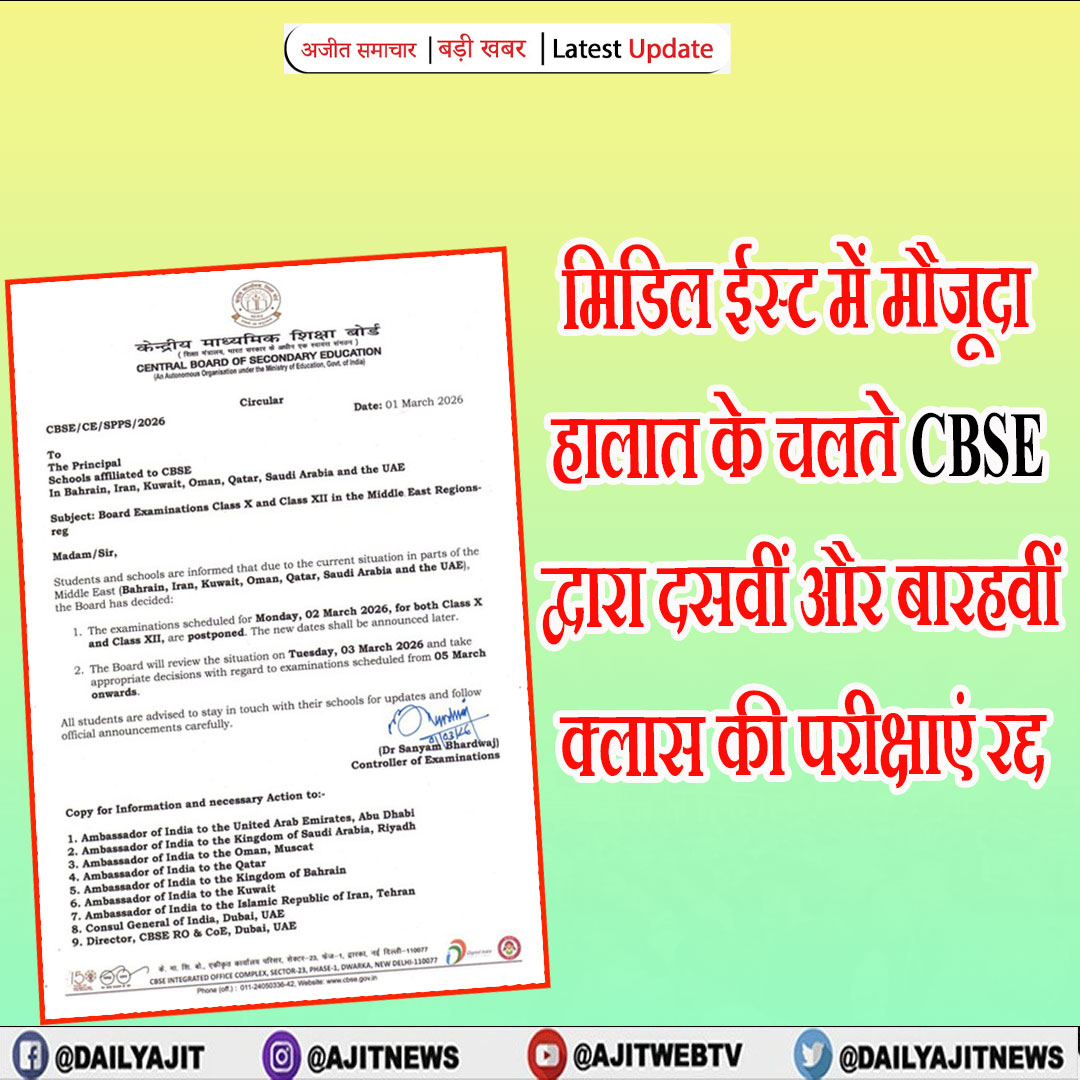 नई दिल्ली, 1 मार्च - स्टूडेंट्स और स्कूलों को बताया जाता है कि मिडिल ईस्ट (बहरीन, ईरान, कुवैत, ओमान, कतर, सऊदी अरब और UAE) के कुछ हिस्सों में मौजूदा हालात की वजह से, CBSE ने तय किया है कि सोमवार, 02 मार्च 2026 को होने वाली दसवीं और बारहवीं क्लास की परीक्षाएं टाल दी गई हैं। नई तारीखें बाद में बताई जाएंगी। बोर्ड मंगलवार, 03 मार्च 2026 को हालात का जायजा करेगा और 05 मार्च से होने वाली परीक्षाओं के बारे में सही फैसला लेगा।