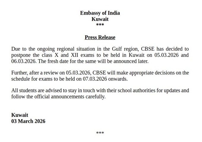कुवैत, 3 मार्च - कुवैत में भारतीय दूतावास ने कहा कि खाड़ी क्षेत्र में चल रहे क्षेत्रीय हालात के कारण, CBSE ने कुवैत में 05.03.2026 और 06.03.2026 को होने वाली दसवीं और बारहवीं की परीक्षाएं टालने का फैसला किया है। इसकी नई तारीख बाद में बताई जाएगी।