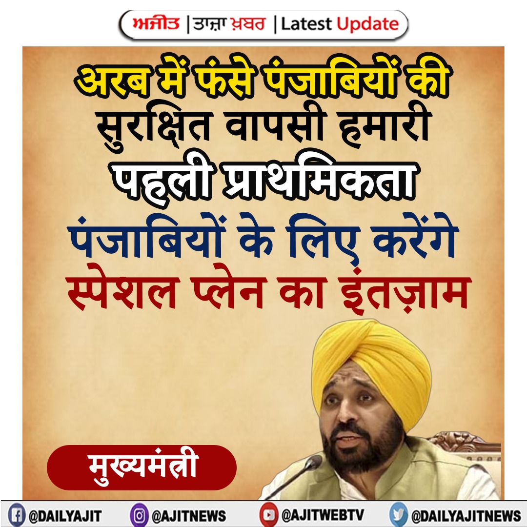 मुख्यमंत्री ने सोशल मीडिया पर लिखा है कि वह कैबिनेट मंत्री डॉ. रवजोत सिंह जी को केंद्रीय नागरिक उड्डयन मंत्री श्री राम मोहन नायडू जी के पास भेज रहे हैं। वह मांग करते हैं कि पंजाबियों के लिए एक स्पेशल प्लेन का इंतज़ाम किया जाए। अरब देशों में फंसे हमारे पंजाबियों की सुरक्षित वापसी हमारी सरकार की सबसे बड़ी प्राथमिकता है।