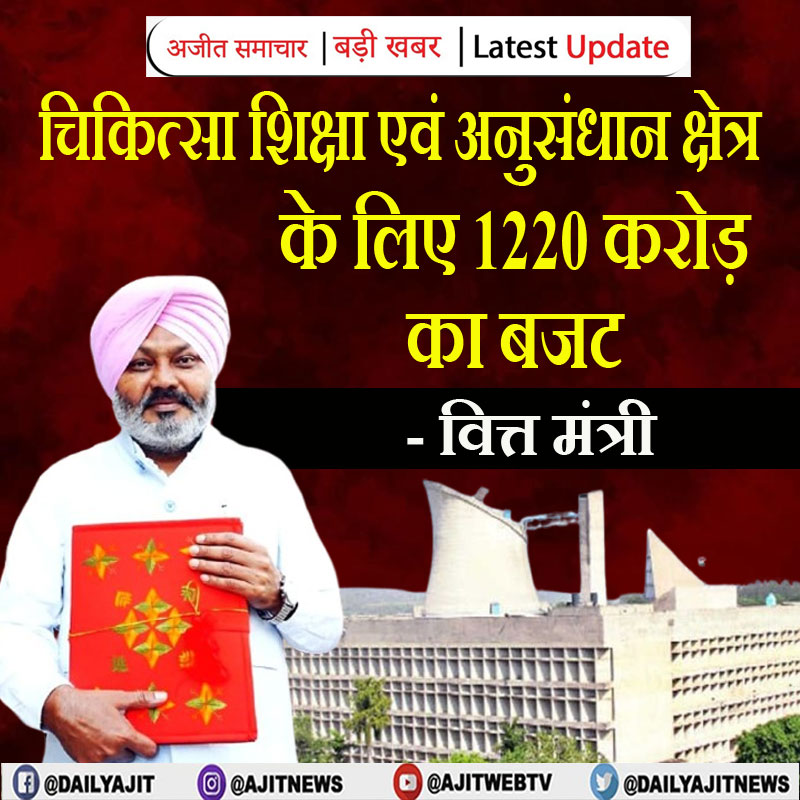 चंडीगढ़, 8 मार्च -वित्तीय वर्ष 2026-27 के लिए चिकित्सा शिक्षा एवं अनुसंधान क्षेत्र के लिए 1220 करोड़ रुपये का बजटीय प्रावधान किया गया है।