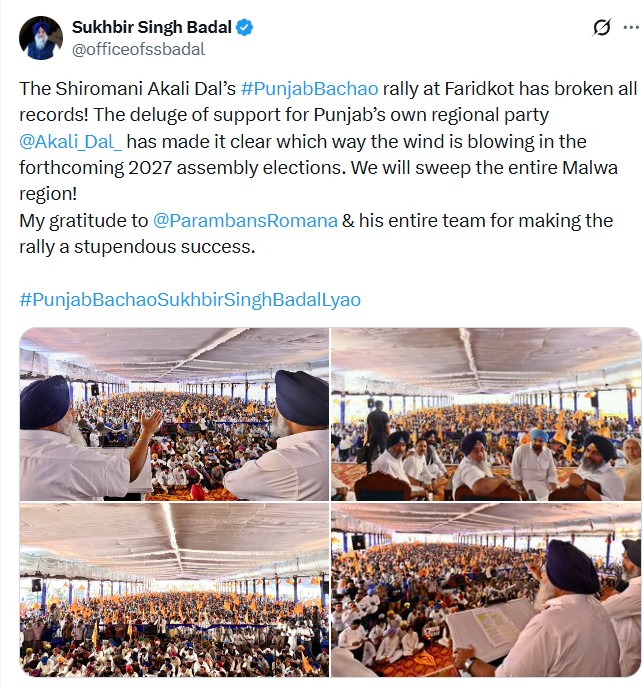 फरीदकोट, 16 मार्च- फरीदकोट में हुई शिरोमणि अकाली दल की पंजाब बचाओ रैली ने सारे रिकॉर्ड तोड़ दिए हैं। शिरोमणि अकाली दल के प्रेसिडेंट सुखबीर सिंह बादल ने अपने सोशल मीडिया हैंडल से एक पोस्ट शेयर करते हुए पंजाब में अपनी रीजनल पार्टी शिरोमणि अकाली दल को मिले ज़बरदस्त सपोर्ट के लिए लोगों का शुक्रिया अदा किया। उन्होंने कहा कि यह साफ़ हो गया है कि आने वाले 2027 के असेंबली इलेक्शन में हवा किस तरफ़ बह रही है। सुखबीर सिंह बादल ने कहा कि हम पूरे मालवा इलाके में ज़बरदस्त जीत दर्ज करेंगे। इस मौके पर उन्होंने रैली को कामयाब बनाने के लिए हलका इंचार्ज परमबंस सिंह रोमाना और उनकी पूरी टीम का भी शुक्रिया अदा किया।