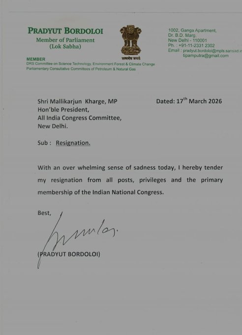 नई दिल्ली, 17 मार्च - असम कांग्रेस के लोकसभा सांसद प्रद्युत बोरदोलोई ने पार्टी से इस्तीफा दे दिया है। उनके इस्तीफे में लिखा है कि आज बहुत दुख के साथ, मैं इंडियन नेशनल कांग्रेस के सभी पदों, खास अधिकारों और प्राइमरी मेंबरशिप से इस्तीफा दे रहा हूं।