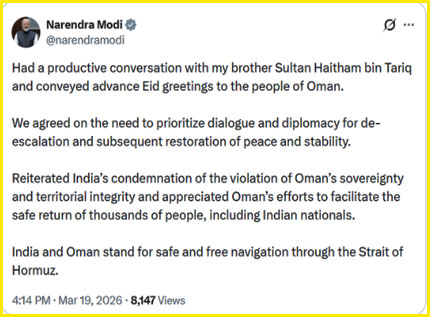 नई दिल्ली, 19 मार्च - प्रधानमंत्री नरेंद्र मोदी ने ट्वीट किया, "मेरे भाई सुल्तान हैथम बिन तारिक के साथ अच्छी बातचीत हुई और ओमान के लोगों को ईद की एडवांस बधाई दी। हम तनाव कम करने और उसके बाद शांति और स्थिरता बहाल करने के लिए बातचीत और डिप्लोमेसी को प्राथमिकता देने की ज़रूरत पर सहमत हुए। ओमान की संप्रभुता और क्षेत्रीय अखंडता के उल्लंघन की भारत की निंदा दोहराई और भारतीय नागरिकों समेत हज़ारों लोगों की सुरक्षित वापसी में मदद करने के ओमान के प्रयासों की तारीफ़ की। भारत और ओमान होर्मुज़ स्ट्रेट से सुरक्षित और फ़्री नेविगेशन के लिए खड़े हैं।"