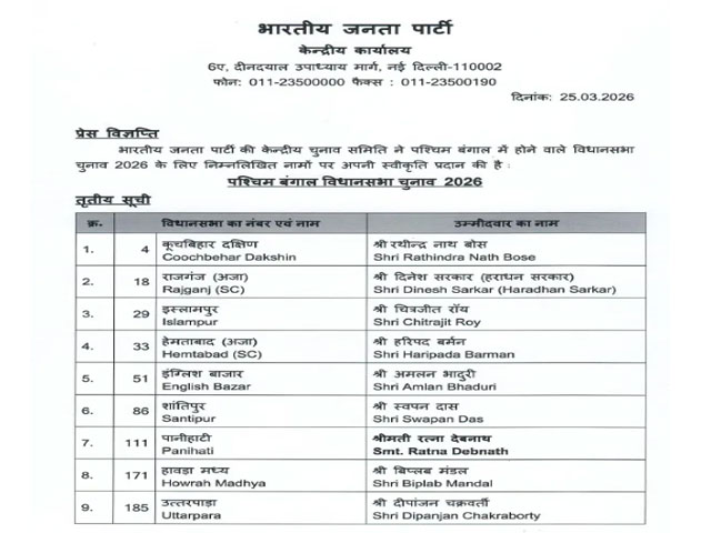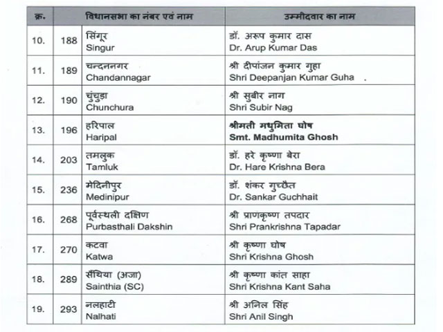 नई दिल्ली, 25 मार्च - भारतीय जनता पार्टी ने पश्चिम बंगाल विधानसभा चुनावों के लिए उम्मीदवारों की तीसरी सूची बुधवार शाम को जारी कर दी। तीसरी सूची में भाजपा ने 19 उम्मीदवारों के नामों का एलान किया है। इससे पहले भाजपा ने पश्चिम बंगाल विधानसभा चुनाव के लिए पहली सूची में 144 और दूसरी सूची में 111 उम्मीदवारों के नामों का एलान किया था। इसमें निसिथ प्रमाणिक, प्रियंका टिबरेवाल और रूपा गांगुली जैसे प्रमुख नाम शामिल थे। पार्टी अभी तक 274 उम्मीदवारों के नामों का ऐलान कर चुकी है।