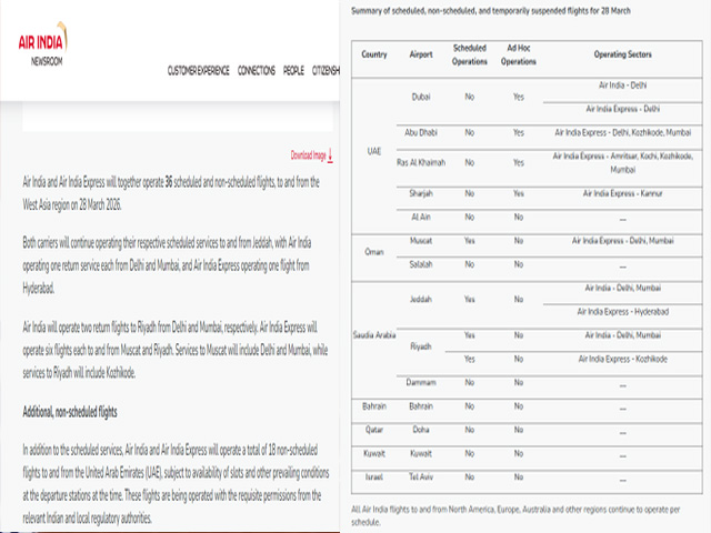 नई दिल्ली, 27 मार्च - एयर इंडिया और एयर इंडिया एक्सप्रेस मिलकर 28 मार्च 2026 को पश्चिम एशिया क्षेत्र से 36 शेड्यूल्ड और नॉन-शेड्यूल्ड उड़ानें संचालित करेंगे।