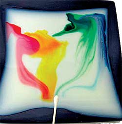 अब रुई के फाये के दूसरे सिरे पर थोड़ा सा लिक्विड साबुन रगडें। जिस जगह दूध को पहले स्पर्श किया था अब फिर उसी जगह को लिक्विड साबुन वाले सिरे से स्पर्श करें। देखें इससे क्या होता है? लिक्विड साबुन वाले रुई के सिरे से दूध के कुछ अन्य सिरों को स्पर्श करें। आप जब अन्य सिरों पर स्पर्श करना जारी रखते हैं तो क्या होता है? लिक्विड साबुन वाले सिरे को कुछ सेकंड के लिए एक ही जगह लगाये रखें। रुई पर ज्यादा साबुन भी लगा सकते हैं। अब क्या होगा? जब आपने बिना साबुन वाला सिरा दूध से स्पर्श किया तो कुछ नहीं हुआ लेकिन जब साबुन वाला सिरा स्पर्श किया तो खाद्य रंग जल्दी से रुई से दूर हो गया। दूर भागते खाद्य रंग दूध पर इंद्रधनुष बना देते हैं। यह सब इसलिए हुआ क्योंकि साबुन ने दूध की सरफेस टेंशन को कम कर दिया और खाद्य रंग उस जगह जाने लगे जहां दूध की सरफेस टेंशन अधिक थी।