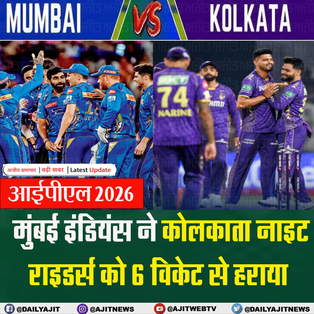 #आईपीएल 2026- मुंबई इंडियंस ने कोलकाता नाइट राइडर्स को 6 विकेट से हराया