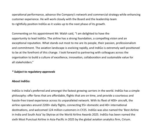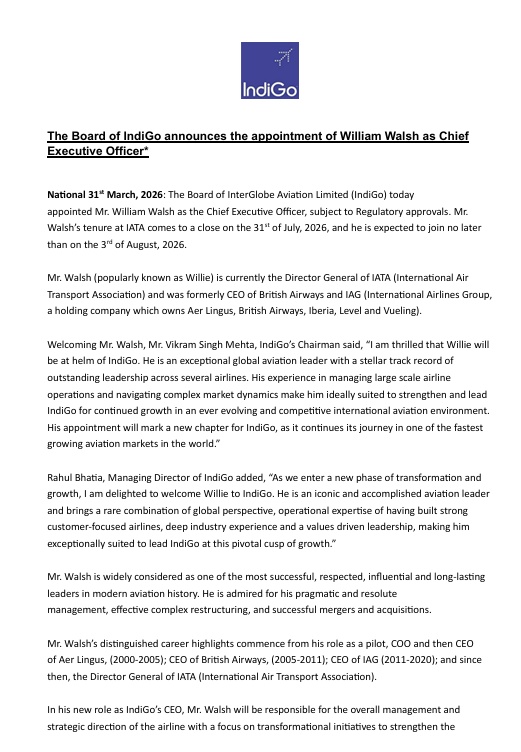 इंडिगो के बोर्ड द्वारा विलियम वॉल्श को मुख्य कार्यकारी अधिकारी नियुक्त करने की घोषणा की