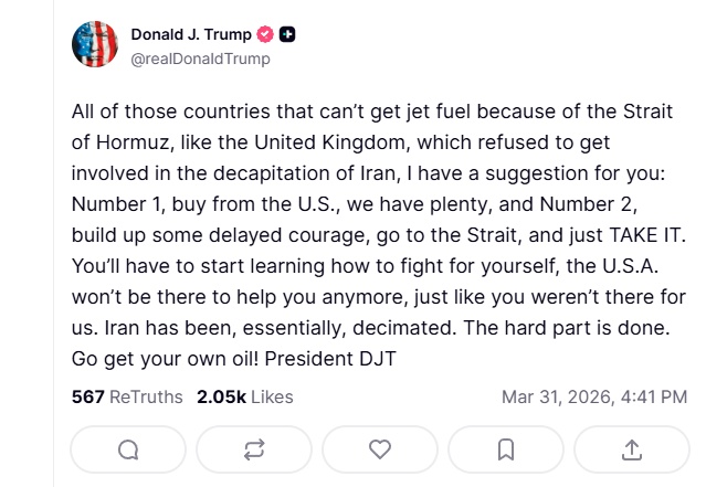 अमेरिका के राष्ट्रपति डोनाल्ड ट्रंप ने 'ट्रुथ सोशल' पर पोस्ट किया कि वे सभी देश जिन्हें होर्मुज जलडमरूमध्य के कारण जेट ईंधन नहीं मिल पा रहा है। मेरे पास आपके लिए एक सुझाव है: पहला, अमेरिका से खरीदें—हमारे पास इसकी कोई कमी नहीं है; और दूसरा, थोड़ी हिम्मत जुटाएँ, उस जलडमरूमध्य तक जाएँ, और बस उसे ले लें।